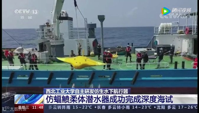 西工大仿蝠鲼柔体潜水器完成深度海试