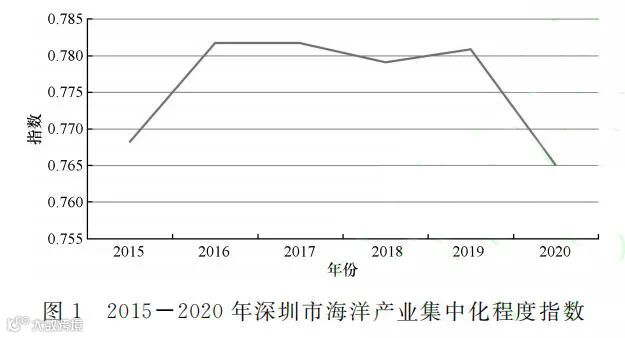 深圳市海洋产业高度集中于海洋旅游业、海洋交通运输业和海洋油气业等传统产业及海洋工程 装备制造业、涉海金融服务业、海洋药物和生物制 品业、海洋电子信息(主要包括海洋信息服务业、海 洋技术服务业)等海洋新兴产业,上述产业增加值 占全市海洋产业增加值比重超过98%,占据绝对主 导地位。由图1可知,2015—2020年深圳市海洋产业集 中化程度指数均大于0.5,最小值也超过了0.765, 说明深圳市海洋产业一直处于高度集中状态。从时 间变化来看,深圳市海洋产业集中化指数由2015年的 0.768增 长 至 2017 年 的 0.782,之 后 基 本 保 持 在 0.78左右,说明深圳市海洋产业类型集中化程度进一 步加强,但2020年下降至0.765。从 2015—2020 年 深圳市海洋产业增加值增量来看,其主要增量集中 于海洋旅游业、海洋交通运输业、海洋油气业等传 统海洋产业及海洋工程装备制造业、海洋药物和生 物制品业等新兴产业,从侧面说明深圳市海洋产业 集中化程度增强。
