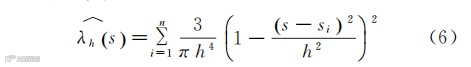 核密度估计法能够利用数据样本本身的空间属性研究空间数据分布特征[11],通过可视化图形可以清晰地反映数据要素在区域内的分散和集聚状态。采用此方法将深圳市各产业涉海企业抽象为“点”,对深圳市各产业的空间分布及集聚的情况进行定量研究。同时,由于引入了搜索带宽,带宽内要素的权重随其到中心的距离增加而衰减,因此密度估计结果较为平滑,可得到连续的密度表面,不会出现剧烈的密度变化,从而得出要素在区域内的集聚情况。其公式为: