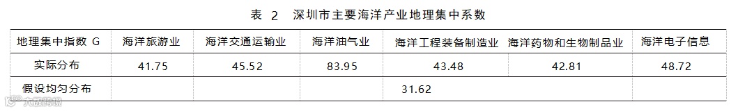 深圳市海洋产业高度集中于海洋旅游业、海洋 交通运输业和海洋油气业等传统产业及海洋工程 装备制造业、海洋药物和生物制品业、海洋电子信 息等海洋新兴产业,其主要海洋产业空间分布极不 均衡,呈现明显的集聚性。通过地理集中系数定量 分析其聚集情况,计算得到海洋旅游业、海洋交通 运输业、海洋油气业、海洋工程装备制造业、海洋药 物和生物制品业、海洋电子信息产业的地理集中指 数(表2);若其均匀分布在深圳各区,则地理集中指 数G 为31.62。