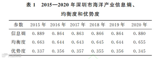 根据信息熵模型公式计算得到深圳市海洋产 业类型的信息熵、均衡度和优势度(表1)。
