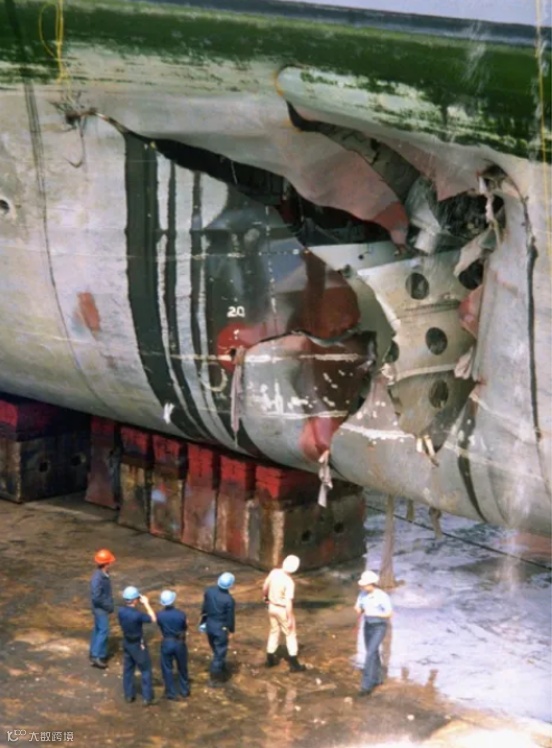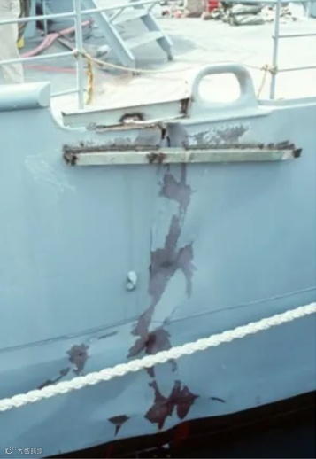 图2 普林斯顿号(CG-59)船体裂缝。1991年2月18日,该舰在波斯湾巡逻时引爆伊拉克布放的MANTA水雷而造成的部分损坏