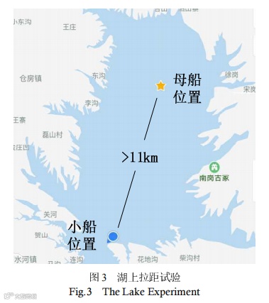 2017 年 1 月,在丹江口水库进行了湖上拉距与性能测试试验。水库水深 40 米左右,拉距最远距 离 12km 左右,由于受地理环境限制,释放器布放在母船水下 30 米左右,甲板单元换能器布放在小船水下 5 米左右,拉距时小船携带甲板单元往外航 行,在行驶过程中不间断进行指令测试,在最远距 离 11.7km 处,测试了释放器的检测概率和虚警概率,共发射 100 组水声遥控指令(其中释放指令 25组),正确接收共 97 组,释放成功率 100%。