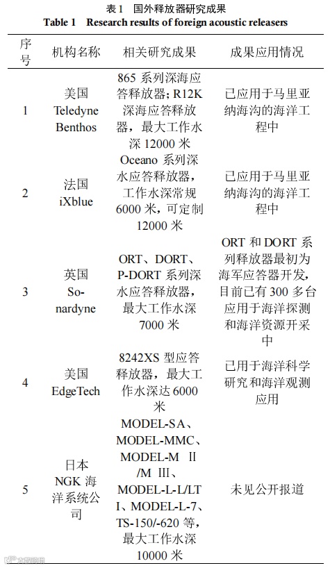 国外的声学释放器技术已较为完善,研制了多种型号的声学释放器产品,并逐步向多功能多特性方向发展。国外比较著名的声学释放器生产厂商有美国 Teledyne Benthos 公司和 EdgeTech 公司、法国iXbule 公司、英国 Sonardyne 公司以及日本 NGK 海洋系统公司等。美国 Teledyne Benthos 公司在水下工程仪器设备的开发一直处于世界领先水平,先后开发出一系列适用于不同水深的声学释放器,被广泛应用于国内外的海洋调查研究中。其 865 系列释放器为深海型,工作水深可达 12000 米,工作寿命标准 2 年,可选 4 年,可完成 25 万次释放应答。其新推出的 R12K 深海声学释放器,可用于 12000米深度,最大工作距离 12km,具有倾角显示、电源电压和剩余电量显示等功能[8][9]。国外深海应答释放器产品研究成果如表 1 所示。