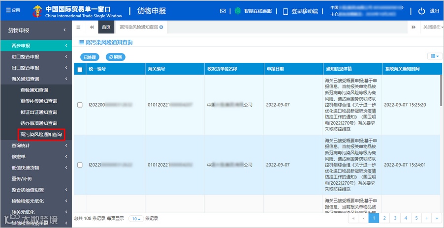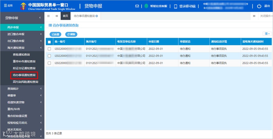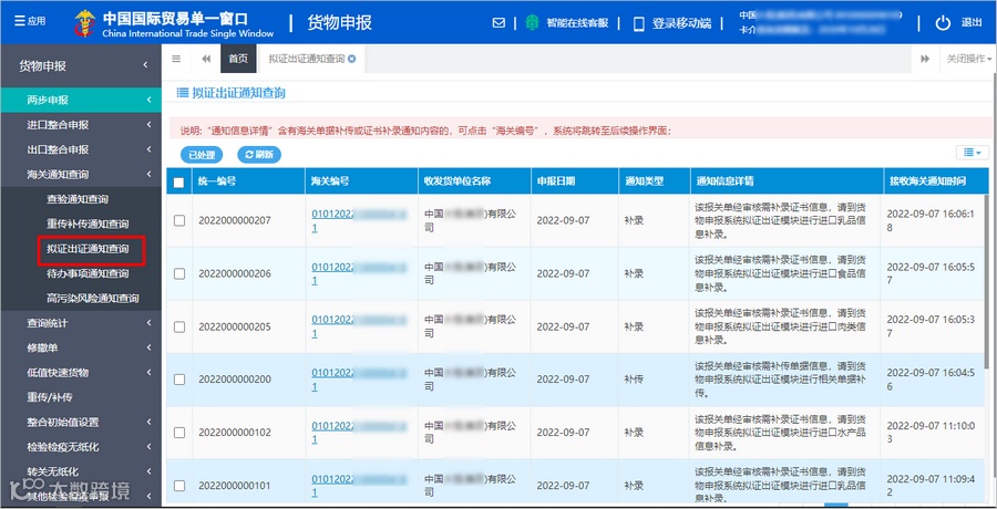 2022年9月7日,“单一窗口”标准版货物申报系统“海关通知查询”再添新功能,增加系统首页通知及四种海关业务通知查询办理功能,包括:重传补传通知查询、拟证出证通知查询、待办事项通知查询、高污染风险通知查询。