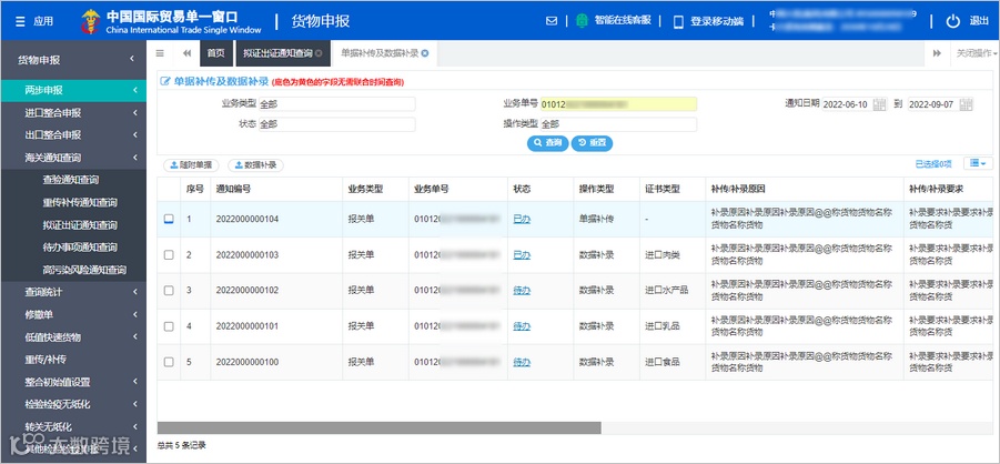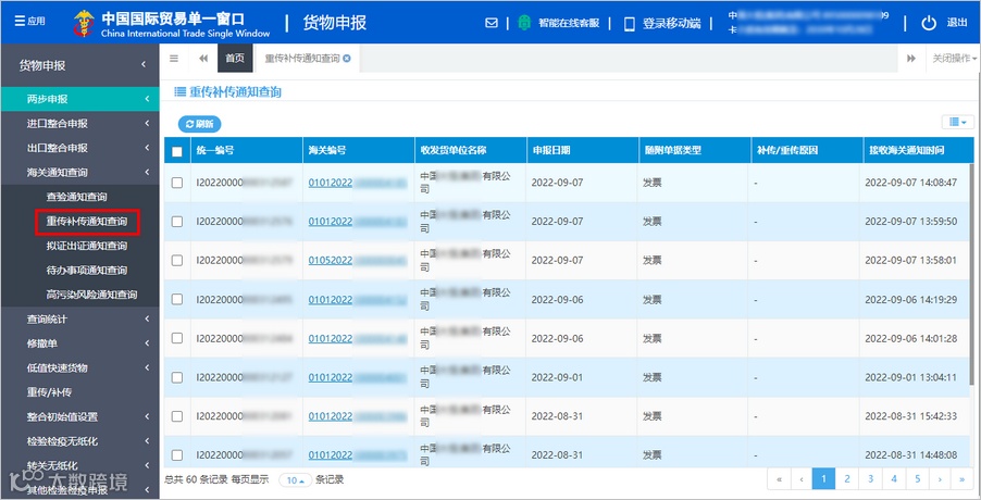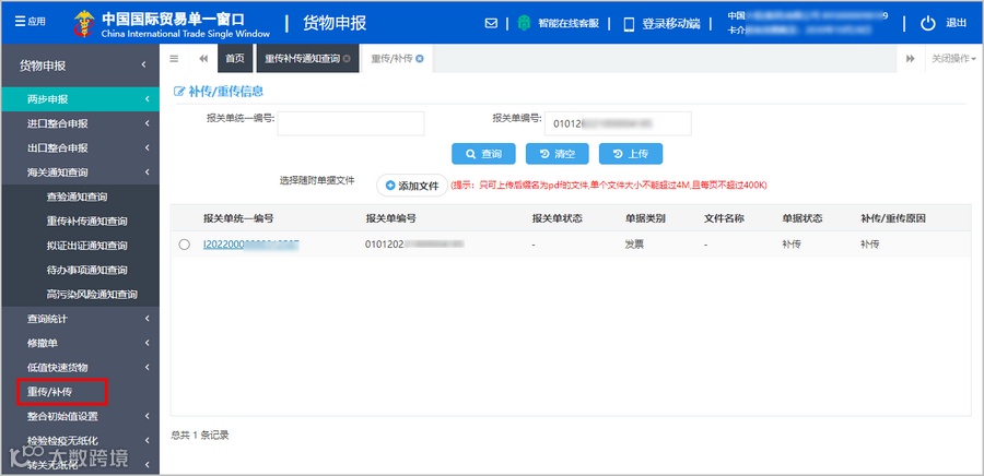 点击查询列表区域任一通知记录的“海关编号”字段,可跳转至重传补传界面: