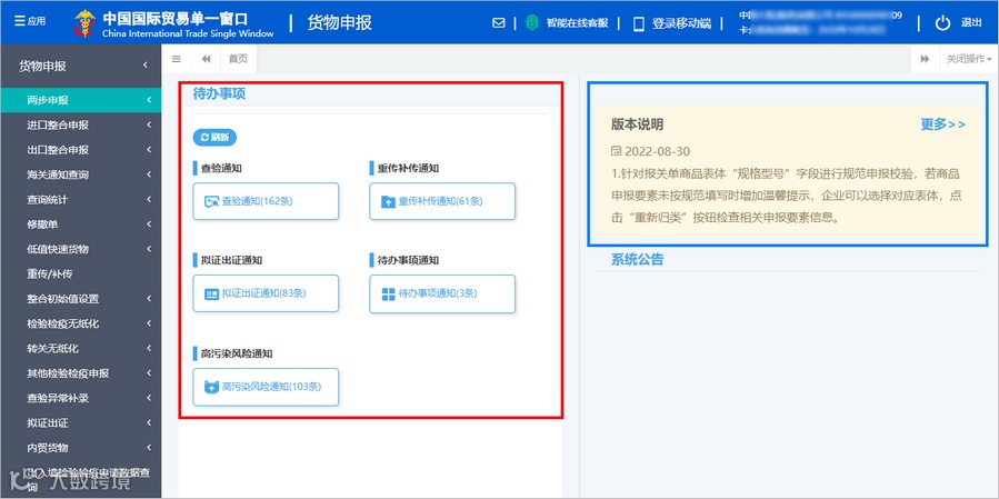 货物申报系统首页增加“待办事项”和“版本说明”两个模块(见下图)。