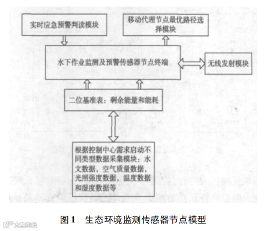 传感器节点功能组成如图 1 所示,其中数据采集模块根据水下监控需求设定通信距离门限值,将数据转发给簇头节点,并具有不同等级的初步应急预警判读模块,及时将判读数据反馈给控制中心; 如果应急等级较高则优先发送给终端节点,这样就可以为水下作业人员提供高优先级的应急预警和控制中心实时救援预案。监测传感器节点终端。