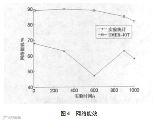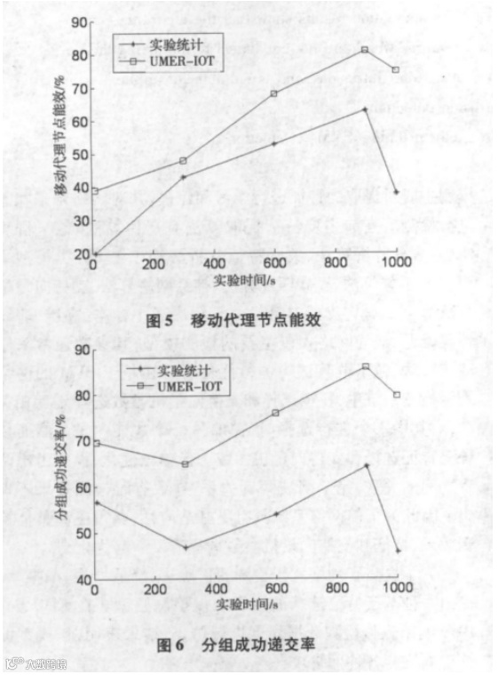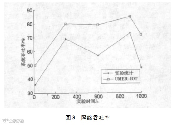图 3 给出了该系统 1000 秒实验分析过程中的实验统计值与 EMUR_IOT 分析值在网络吞吐率上对比结果。发现,网络吞吐率随着通信量的增加在逐步增大,在 600 秒时出现下降,因为某些簇头节点剩余能量低于门限值失效停止转发数据出现监控盲区,而此时 EMUR_IOT 因为控制中心发起移动代理管理机制,由移动代理节点代理该簇头节点继续转发数据。