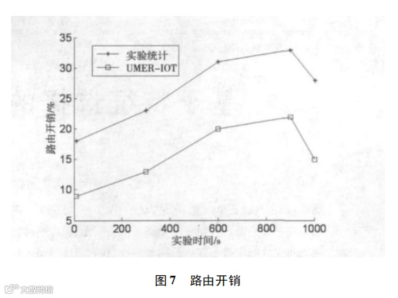 对于 EMUR_IOT 中所采用的基于梯度投影法五步骤的最佳路径选择算法的路由开销情况如图 7 所示。实验统计与 EMUR_IOT 的路由开销变化趋势基本相同,但是 EMUR_IOT 始终高于实验统计结果,这是因为在梯度投影法中设置了最优性条件避免了传感器节点终端有限无线资源的浪费。