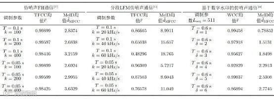 时频相关系数均值r越接近于1,Mel倒谱距离均值dMFCC越小,证明合成哨声和原始哨声差异性越小,通信信号仿生效果和隐蔽性越高。结合图4和表2不难发现,当码元宽度T一定时,增加调制频差∆f会降低时频相关系数并增大Mel倒谱距离,即增加调制频差∆f会降低通信信号的仿生效果;而当调制频差∆f一定时,增大码元宽度T可提高通信信号的仿生效果。总体来看,本文提出的仿海豚哨声FSK水声通信信号的仿生效果较好,各参数平均时频相关系数都在0.99以上,平均Mel倒谱距离不超过3.2。