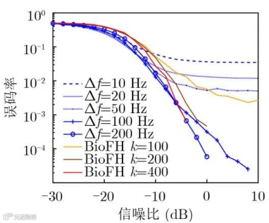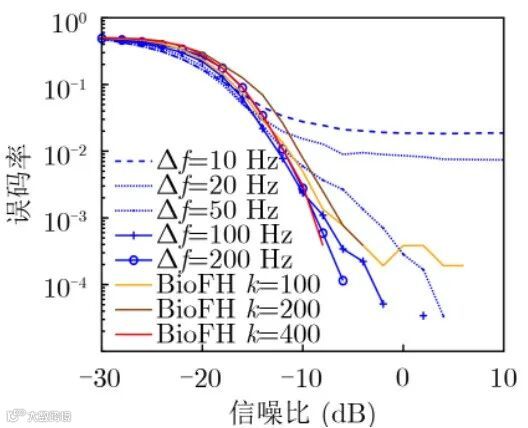 仿哨声FH水声通信算法将连续相位多载波频移键控(Continuous Phase based Multicarrier Frequency Shift Keying,CPMFSK)信号以一定比例系数k与哨声时频谱相加产生合成哨声时频谱,该合成哨声时频谱在每个码元时间内会在一定的频率范围内不停变化,其变化范围由调制系数k决定。而仿海豚哨声FSK调制水声通信算法采用2FSK调制信息,合成哨声频谱在每个码元时间内与原始哨声时频谱的频差保持不变,为固定值∆f,如图4所示。从图5和图6的误码率曲线可知,当频谱最大差异一定时,即调制系数k与调制频差∆f相等时,仿海豚哨声FSK调制水声通信算法的误码率表现更好。当调制频差∆f=200时,仿海豚哨声FSK调制水声通信算法的误码率曲线与k=400的仿哨声FH水声通信算法基本重合,但是仿海豚哨声FSK调制水声通信算法频差更小,因此仿海豚哨声FSK调制水声通信算法仿生效果更强。