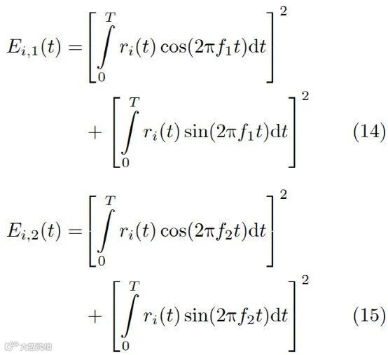 提取rFSK(t)的第i个码元ri(t),求ri(t)在其两种可能的载波频率f1=fc+∆f和f2=fc−∆f上的能量Ei,1(t)和Ei,2(t):