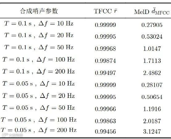 参考文献[17],本文亦选用时频相关系数(TFCC)r和Mel倒谱距离(MelD)dMFCC对仿哨声FSK水声通信信号的仿生效果进行分析。基于表1的参数,每种参数分别产生了1000个合成哨声,计算其与原始哨声的时频相关系数和Mel倒谱距离,结果如表2所示。其中,计算Mel倒谱距离dMFCC时,选取的三角窗函数窗长为0.1s,相邻帧的重叠长度窗长的一半,Mel滤波器个数为24个。