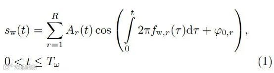 其中,Tω表示海豚哨声时长;R表示最大谐波次数;fw,r(t)=r×fw,1(t)表示第r次谐波的时频谱轮廓曲线,可由基波时频谱轮廓fw,1(t)通过倍频获得;Ar(t)表示第r次谐波随时间变化的幅度;φ0,r表示第r次谐波初始相位。