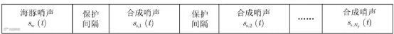 其中,As为合成哨声的幅度,为简化模型在此设置为定值,实际使用时,也可根据所用哨声幅度A1(t)将其设置为随时间变化的幅度As(t);φ0,s表示合成哨声初始相位,本文为简化模型将其设为0。仿哨声FSK通信信号帧结构如图2所示,每帧包含1个原始的海豚哨声信号Sw(t)和NF个合成哨声Ss(t),相邻哨声之间存在保护间隔以降低水声多途信道的影响。