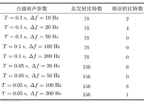 结合3.2节的误码率分析和3.3节的仿生效果分析,对本文所述的仿海豚哨声FSK水声通信算法性能进行综合分析。在该方法中,码元宽度为T和调制频差∆f是两个重要的参数。当码元宽度T一定时,增加调制频差∆f可以有效降低误码率,提高系统的可靠性,但是通信信号的仿生效果会下降。当调制频差∆f一定时,增加码元宽度T可以在几乎不影响通信信号仿生效果的情况下有效降低误码率,提高系统的鲁棒性,但是系统通信速率会下降。因此,在进行参数选择时,需要综合预期的仿生效果、通信系统的速率和可靠性进行合理选择,优先满足预期的仿生效果,通过增加码元宽度T以牺牲通信速率为代价来提高通信系统可靠性。