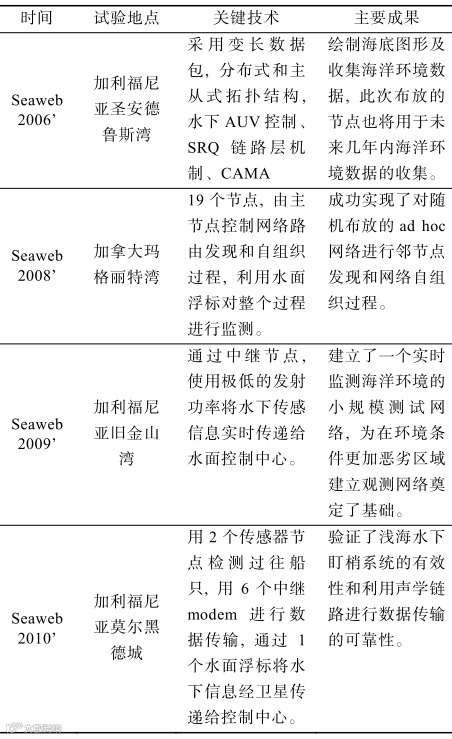 ④在863课题“海洋环境监测传感器网络技术”支持下,中国科学院声学研究所通过研制的小型化、低功耗及通用型水声通信网络声通信节点,分别于2008年和2009年在浙江千岛湖进行了2次湖上组网测试,以正交相移键控相干通信和直接序列扩频通信2种通信方式为基础,完成了4~7节点的自组织组网,实时端对端传输图像、语音以及传感器数据(深度信息)。