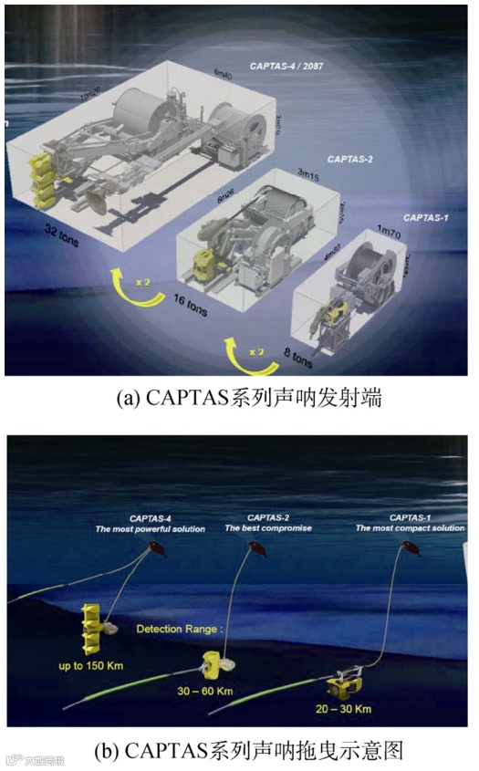 主动声呐自诞生以来,就一直向低频大功率方向发展。低频大功率探测技术逐渐成为探潜的主流技术之一,其核心之一是低频大功率发射换能器技术。国际上,低频大功率发射换能器已经运用于美国的监视拖曳阵传感器系统(SURTASS)主被动联合探测系统(见图4)和HELRAS吊放声呐系统(见图2(b))、欧洲Thales公司的CAPTAS系列声呐(见图5)及Atlas公司的LFTAS声呐。