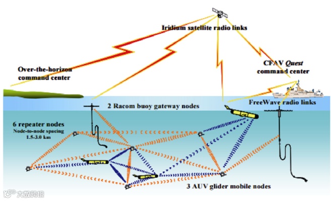 ②在国家自然基金项目支持下,西北工业大学航海学院研制了海空天跨介质通信网络,该网络由5个水下节点和1个水面节点构成。5节点水下通信网络已具备网络自定位功能。