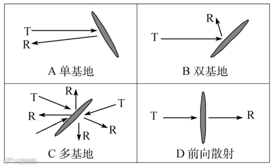 图6 单基地声呐、双基地声呐、多基地声呐和前向散射声呐探测示意图