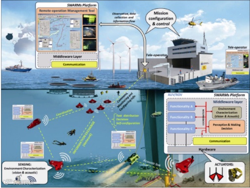 欧盟“地平线2020”(2015~2018年)计划支持下的空地海未来网络试验(RAWFIE)项目,旨在构建涵盖陆地、空中和水下的无人驾驶平台未来物联网的试验系统。“地平线2020”计划支持下的水下机器人智能联合组网项目(SWARMs)项目,其基本概念如图8所示,通过构建基于UUV的合作网络以降低海上作业的成本,提高作业的安全性。