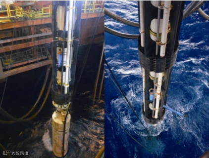 ①在十二五国家重大专项子课题“隔水管疲劳监测系统研究”支持下,西北工业大学航海学院研制了5节点的隔水管疲劳监测网络,5个水下节点固定部署于隔水管上,实时采集隔水管疲劳相关参数,以水声通信方式传输数据,采用TDMA方式接入水面处理节点。该网络分别于2012年、2014年在海洋石油“981”平台,2015年在兴旺号石油平台完成了3次海上试验,试验结果表明,该系统能够长期有效地进行隔水管疲劳参数的采集与传输。图9为该项目2014年在海洋石油“981”平台海试时其中2个节点的布放场景。