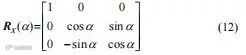 姿态传感器可以测出载体的姿态角,包括方位角、纵摇角和横摇角,已知直角坐标系O-XYZ 相对于直角坐标系O-X'Y'Z'的姿态角,就可由向量法求出绕各轴旋转的旋转矩阵[13]。本文所使用的坐标系均为东北天坐标系从坐标轴正向看原点,逆时针旋转为正,顺时针旋转为负,旋转顺序由姿态传感器确定为Z-X-Y[14-15]。绕X轴旋转α角的旋转矩 RX(α)为