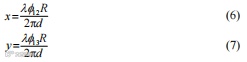 式中:φ12为1、2 号水听器阵元接收信号相位差;φ13为1、3号水听器阵元接收信号相位差。将式(4)、(5)代入式(1)、(2),可得: