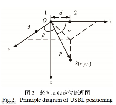 超短基线定位是通过定位换能器发射高频信号、测量其到达接收基阵阵元之间的相位差和测量目标到基阵中心的斜距来实现定位[11],其原理如图2所示,由 3 只水听器构成平面坐标系 xOy,设定位声源位于S处,声源到1号水听器阵元的距离R通过测量声波在水下传播的时间可以计算出来,它的方向余弦为