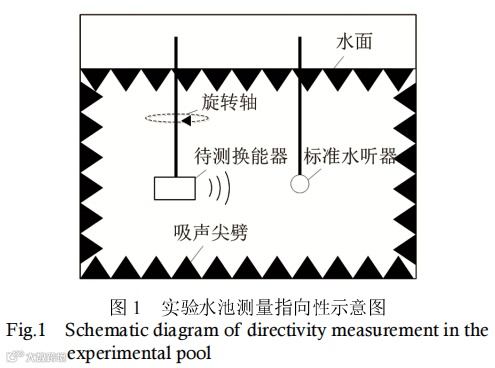 根据《声学水声换能器测量:GB/T 7965—2002》,换能器指向性测量标准的实验室测量法[8]如图1所示。消声水池侧壁及水面贴附吸声材料消除边界声波反射,待测换能器固定在旋转轴上刚性吊放至水中,相隔已知距离放入标准水听器,距离选择应满足远场测量条件,旋转待测换能器,记录下旋转的角度和标准水听器测得的声压,将归一化后的声压值作为极径,旋转角度作为极角即可绘制换能器极坐标下的指向性图。