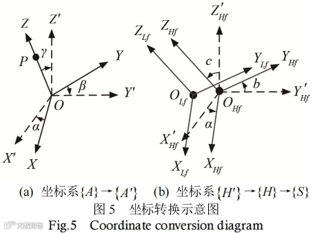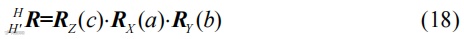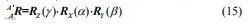 从坐标系O-XYZ(记为坐标系A)转换到坐标系O-X'Y'Z'(记为坐标系A')时,依次绕Z、X、Y轴旋转γ、α、β角,旋转矩阵的表达式为