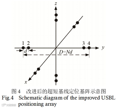 即阵元间距应满足d≤0.5λ ,否则会出现相位测量模糊的现象。为了在高定位精度下解决相位模糊的问题,改进了超短基线基阵,改进后的阵列如图4所示。