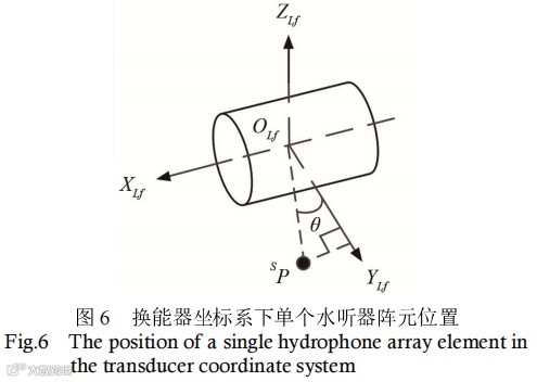 由于定位换能器与待测换能器刚性连接,该位置可在入水前直接测量确定。待测换能器坐标系OLF-XLFYLFZLF 中,XLF轴与主声轴重合,如图 6 所示。可得水听器阵元与换能器主声轴的夹角θ :