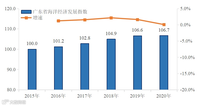 据广东省海洋发展规划研究中心和国家海洋信息中心联合发布《2021广东省海洋经济发展指数》中指出:“十三五”期间广东海洋经济发展指数年均增速1.3%,总体保持平稳增长。2020年,广东努力克服疫情冲击和国际环境不利影响,海洋经济运行稳定恢复,发展质量稳中有升,总指数为106.7,比2019年增长0.1%。