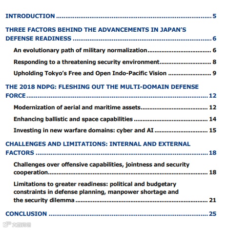5.结论:日本正以“进攻是最好的防御手段”的理念进行战备,专注预先防御与威慑;备战多域战;重点提高备战有效性与效率,关注战略配置