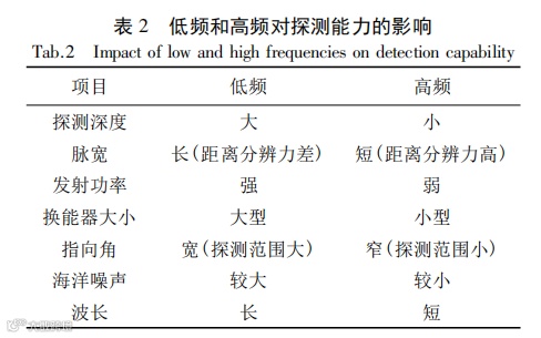 为了能更精确地判断鱼群回波所包含的信息,原有的单频探鱼仪进行了改进,有的垂直探鱼仪如 69-3 型探鱼仪和 TCL-204 型探鱼仪采用了低频 24 kHz 和高频 200 kHz 两种工作频率,可以根据需要转换使用。汕尾市快捷通导设备有限公司旗下的 ONWA KF-293、Kfish-7 等双频探鱼仪目前在市场上广泛应用,设备配置有 50 kHz 和200 kHz 两种探测频率,脉冲频率越低,探测范围越宽。因此,50 kHz 的频率可以用于一般的检测和判断海底状况,200 kHz 的频率可以用于详细的鱼群观察。探鱼仪工作频率的高低,影响探测深度和指向角等,从而影响探测范围和分辨能力等,表 2 展示了低频和高频对探测能力的影响。