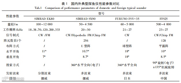 国外对渔业声学探测技术的研究起步较早,在 20 世纪 30 年代初,人们已将测深仪运用在渔业上,经过几十年的发展,其关键技术取得了长足的发展。近年来,以日本 FURUNO 公司和挪威 SIMRAD 公司为代表的渔业电子装备厂商开始了新一代的多波束探鱼仪系统的研制工作。日本古野旗下的 FSV-35 最大量程达 5 000 m,且实现了水平 360°全向探测。挪威 SIMRAD旗下的多波束探鱼仪 SIMRAD SX90 最大探测距离为 4 500 m,可以实现 360°水平全向探测,垂直方向发射波束倾角达- 10° ~ + 90°,大大提高了探测到鱼群的概率。SIMRAD EK80 采用宽频覆盖结合先进的信号处理技术是目前渔业领域较为先进的分裂波束回声探测仪,可同时发射多种频率,多个频率覆盖同一采样水体,其探测效率明显提升,广泛应用在海洋渔业声学探测领域。