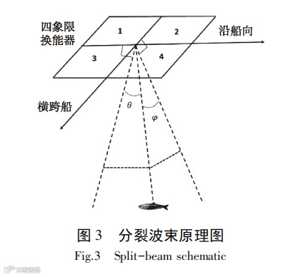 分裂波束技术能够测量目标在波束中的三维位置,并可直接测定自然状态下鱼体的目标强度及观测鱼类个体的行踪[17]。分裂波束探测系统具有很宽的频带范围,可同时在不同频段上对海洋生物、海底资源进行探测,因此有足够的分辨率来处理较小的浮游动物及较大的鲸类声音信号[18-19]。该系统运用 4 个象限的换能器,通过发射电路将电信号转换为脉冲并发射到水中,声波在传播过程中遇到海洋生物反向散射到换能器。接收时每个象限换能器独立接收,通过比较各象限接收到的信号确定目标方向[18,20]。在实际海洋渔业探测中,利用分裂波束技术确定目标在波束中的位置,并根据波束的指向性对偏离声轴的回声信号进行补偿,从而实现对鱼类目标强度的客观估测,其工作原理如图 3 所示。运用目标跟踪技术可对海洋生物的运动轨迹、游动速率及方向等参数进行测算[18,20-22]。