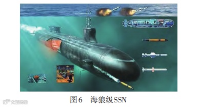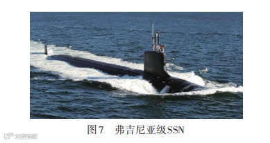 由于作战需求,该级 SSN 设计中加入许多以往美国潜艇所不具备的元素,例如能在噪声严重的浅海有效操作的声呐系统 (特别是 CHIN 型高频主动声呐)、水雷侦测/反制装备以及多种无人遥控载具的操作能力、完善的特战部队相关设施等,而这些都将对现行美国海军的潜艇运用方式造成巨大的冲击与改变。弗吉尼亚级 SSN 见图 7所示。