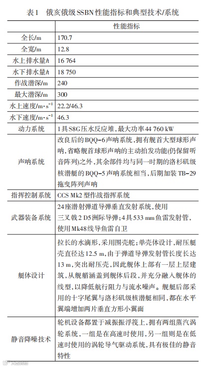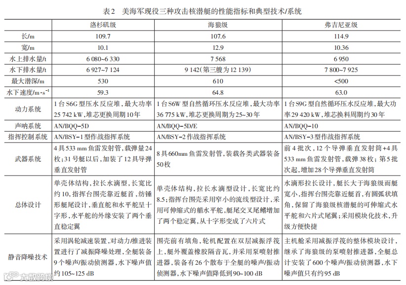 装备洛杉矶、海狼和弗吉尼亚三级约52艘多用途攻击型核潜艇。这三级核潜艇作战需求明确、技术先进且时代特征鲜明,其性能指标和典型技术/系统见表2所示。