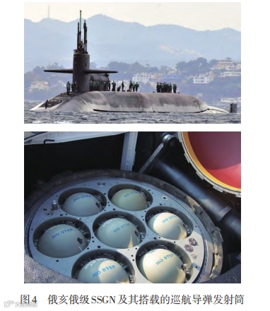 美军现装备 4 艘由最早服役的 4 艘俄亥俄级SSBN改装而来的巡航导弹攻击型核潜艇。改造中,将24个弹道导弹发射筒中的22个改造成为巡航导弹发射筒,每个发射筒可填装 7 枚战斧式巡航导弹,见图 4 所示,搭载巡航导弹的数量大幅增加到了154枚。