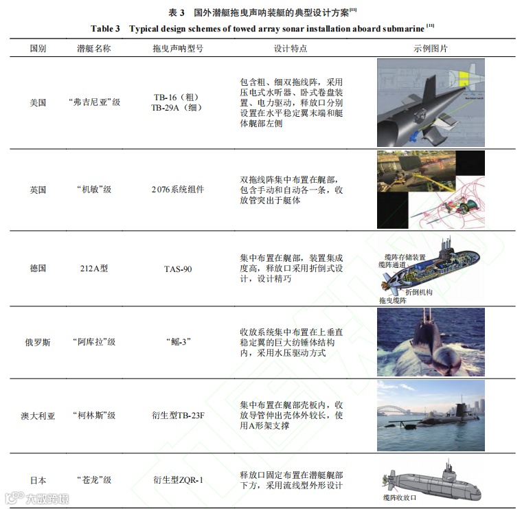 表 3 给出了国外几种典型潜艇的拖曳声呐装艇设计基本信息。