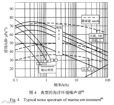 使用拖曳声呐时,潜艇的辐射噪声会通过直达,海面、海底反射等传播途径影响拖曳声呐的工作,反映在声呐显示器上的效果就是某段时间内在某个角度上有一个稳定且较强的声目标(本艇)。本艇的辐射噪声频段通常会覆盖拖曳声呐的全部工作频段。为削弱本艇的辐射噪声对拖曳声呐探测的影响,可在本艇与线列阵之间合理地设计拖缆长度 Lcable,将本艇的辐射噪声级经过传播损失后降低至环境噪声水平以下。图 4 所示为典型的海洋环境噪声谱[6],其中 100~1 000 Hz 频段是主流拖曳声呐工作频段。该频段内的环境噪声主要来源于航运、海浪、降雨产生的噪声等。