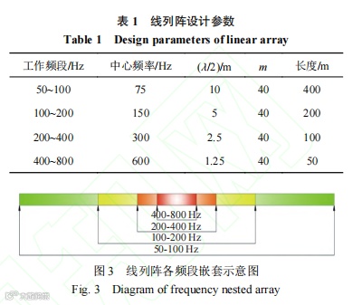 由式(1)可计算得到 m=40,即每个倍频程上至少使用 40 个阵元,阵元间距为中心频率所对应波长的一半。完整的线列阵各频段如表 1 和图 3所示,且其长度基本上取决于低频段指标要求。