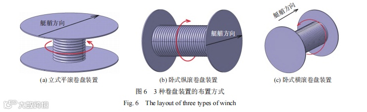卷盘装置的布置按姿态分为立式和卧式,而按旋转方向又分为平滚、纵滚和横滚,如图 6 所示,具体的优缺点如表 2 所示。