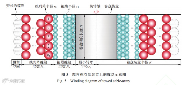 上述假设,恰好是工程设计中应重点关注的。缆阵在受到高温烘烤、海水浸泡、长期载荷的作用下,极有可能在使用一段时间后变长;在排列缆阵过程中,缆阵受到海水冲刷可能出现排列不紧密或处于乱序状态。因此,设计卷盘装置的容纳空间时,应预留 1~2 层的缠绕空间,且卷盘轴向长度设置应尽量与拖缆与线列阵直径匹配(公倍数)。