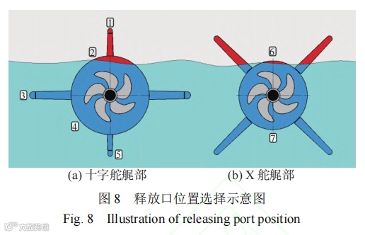 1) 若潜艇采用十字舵,舵翼上含固定结构,可利用此结构来设计缆阵在艇体艉部的通道及安装释放口(如图 8 中 1,3,5 所示位置),采取此处设计的包括俄罗斯“阿穆尔”级常规潜艇和美国“弗吉尼亚”核动力潜艇的细线阵等;