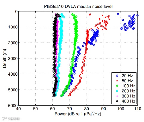 上图为 PhilSea10 实验中声源和阵列的位置,以及测线的航迹。T1 到 T6 为声 层析阵列,在 T6 附近布放了分布式垂直阵(DVLA,Distrbuted Vertical Line Array), 其布放深度覆盖全海深,该阵列的监测时间长达一年。Kathleen 等分析了此次 实验中环境噪声随深度变化的平均值如下所示,得到当频率为 50Hz 时,最深处水听器接收到的环境噪声级比声道轴处低 10 dB。