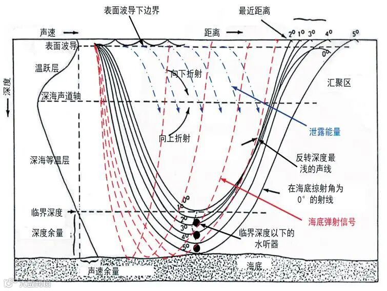 深海声速剖面下声传播路径示意图